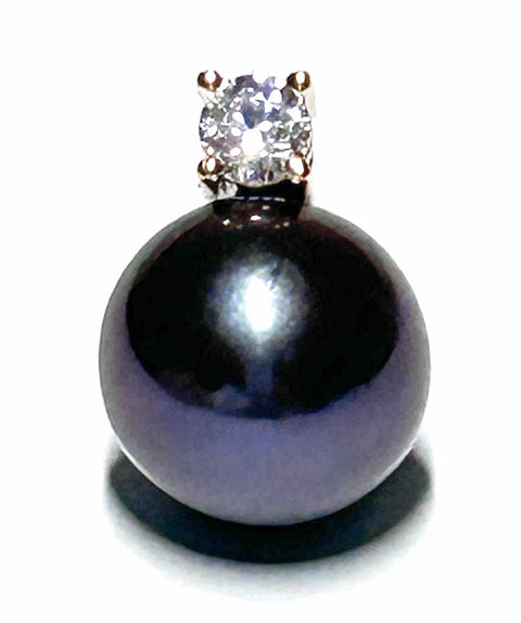 Note: Colors may vary slightly due to screen settings. A captivating pendant featuring a generous peacock black pearl with vivid blue overtone and exceptional brilliance.